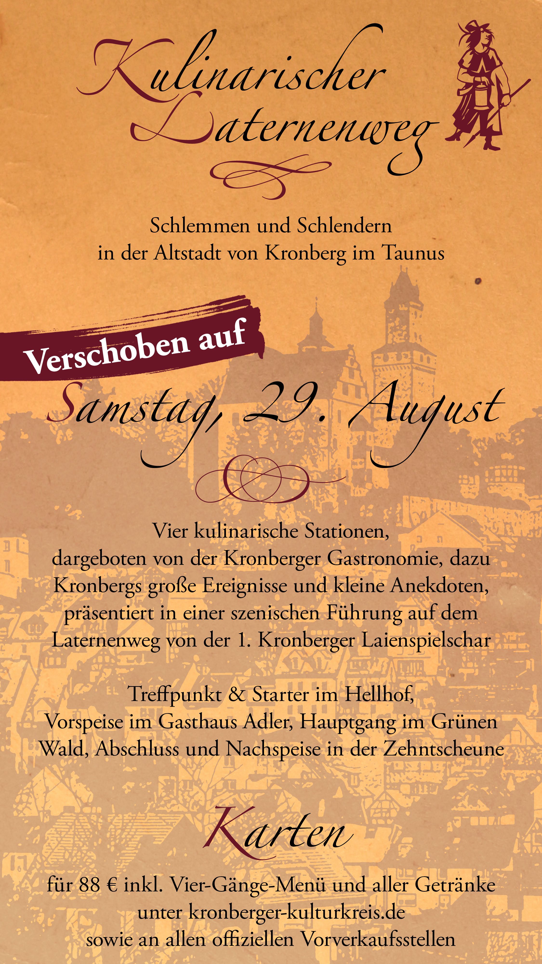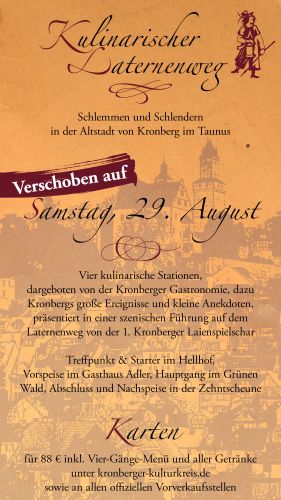 Die 1. Kronberger Laienspielschar lässt entlang des Kronberger Laternenweges Geschichte lebendig werden. Eine szenische Führung entführt Sie in die Zeit der raufenden Ritter und der streitenden Prälaten und begleitet Sie durch die Geschichte Kronbergs.