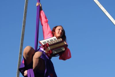 Boss“, der Einspruch erhebt ... Die brasilianische Luftartistin Gabriela Schwab Veloso verknüpft Schauspiel und Bewegung mit viel Witz. Eine clowneske Performance am Vertikaltuch und eine Geschichte über Liebe und Freiheit.