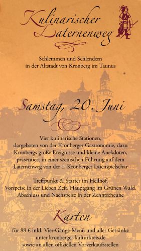 Die 1. Kronberger Laienspielschar lässt entlang des Kronberger Laternenweges Geschichte lebendig werden. Eine szenische Führung entführt Sie in die Zeit der raufenden Ritter und der streitenden Prälaten und begleitet Sie durch die Geschichte Kronbergs.